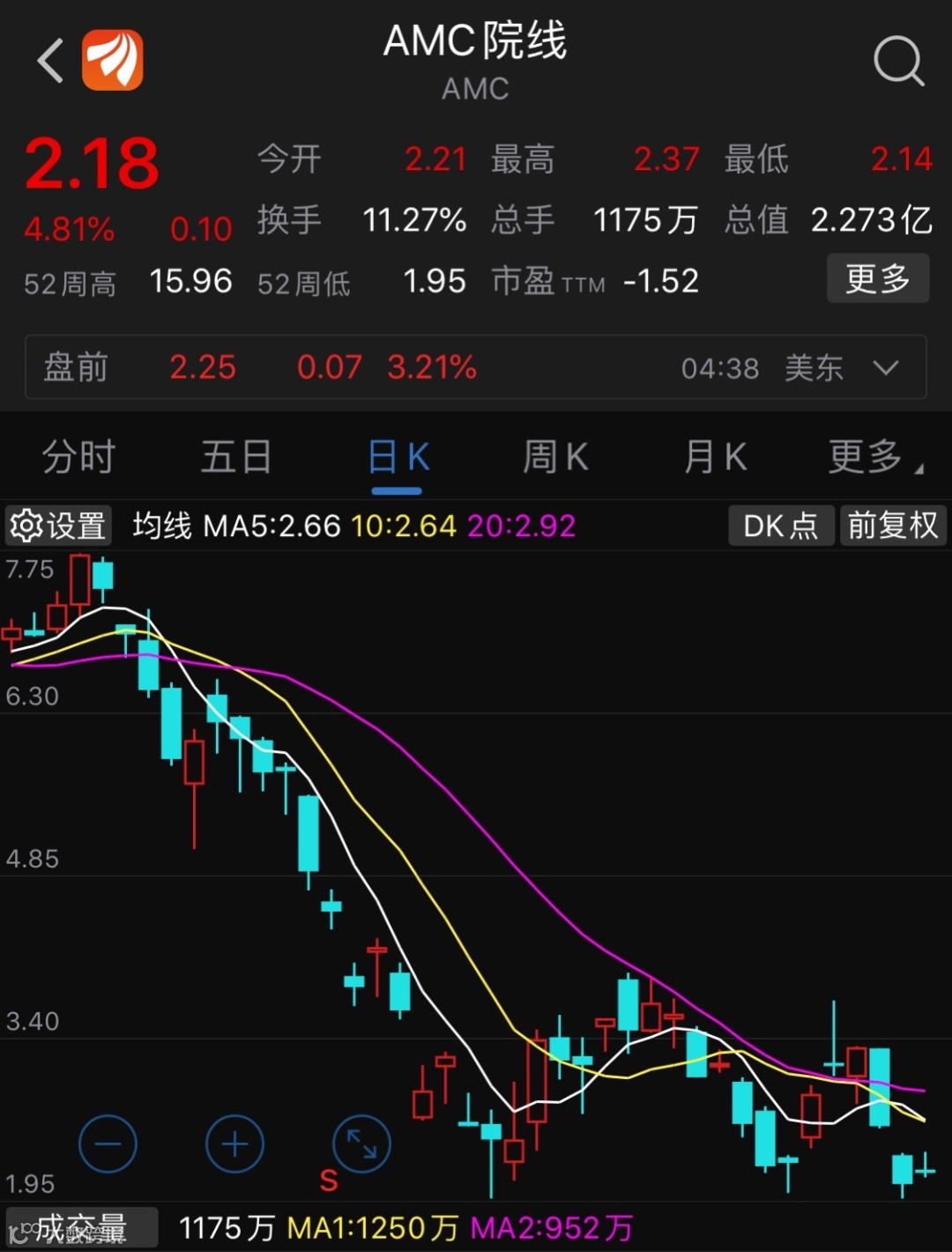 4月9日,AMC院线暴跌21%,随后一个交易日——4月13日,AMC院线再度大跌20%,两天合计跌去37%。4月14日,AMC院线股价有所反弹,收涨4.81%,但相对于两天37%的跌幅,也是“无济于补”。