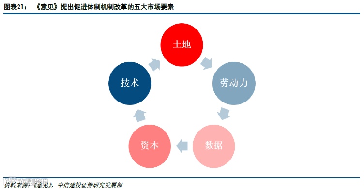 4月9日,中共中央、国务院对外发布了《中共中央国务院关于构建更加完善的要素市场化配置体制机制的意见》。总体的要求是各要素要实现更加市场化,流动更加自主有序,配置效率更加高效,可以起到进一步增加经济活力的作用。《意见》分别就土地、劳动力、资本、技术、数据要素提出完善要求,将数据要素与传统要素并列,体现出国家对于数字经济时代的高度认识。