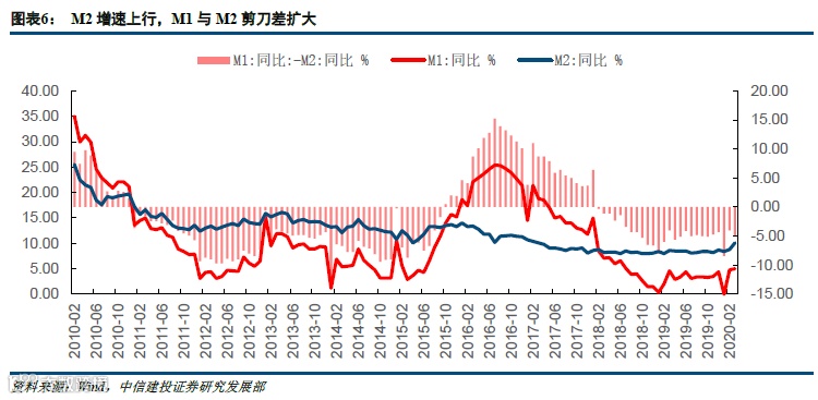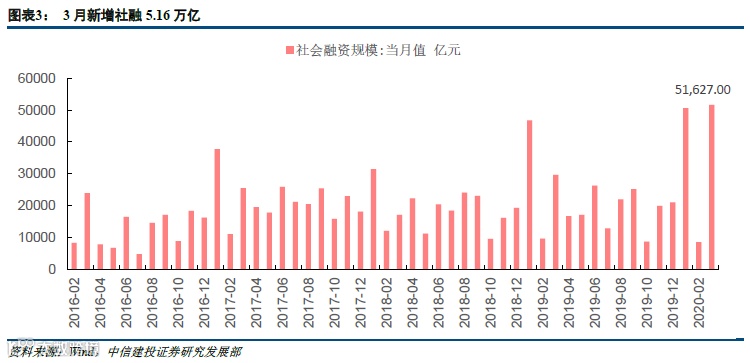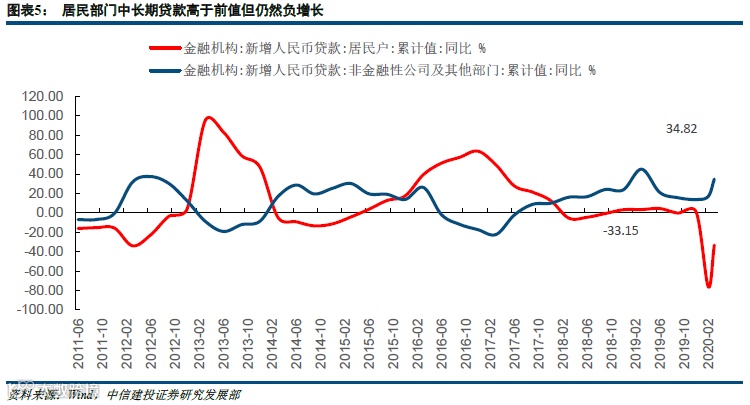 新增人民币贷款28500亿元,市场预期19700亿元,前值9057亿元。其中中长期贷款4528亿元,中长期人民币贷款占比为50%,低于10年平均2月中长期贷款66%的占比。非金融机构及其他部门新增中长期贷款增速35%,处于历史水平中高位,但居民部门中长期贷款增速下降33%,高于前值(-75%)但仍处于负增长区间。这意味着房地产市场受到疫情冲击较为明显。