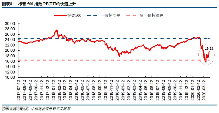 上周美联储再推出2.3万亿美元贷款支持计划提振经济,直接帮助受疫情影响最大的中小企业。本次工具中最核心的是购买信用债和相关ETF,其次是直接对中小企业提供贷款支持。美联储在3月23日推出一级和二级企业信用债便利(PMCCF和SMCCF)并开始购买信用债和相关ETF产品,规模各100亿美元,且规模在财政部注资750亿美元后可以进一步扩大总体购买规模。除此以外,美联储通过小企业管理局工资保护项目的借款便利(PPPLF)和“主街”扩大贷款便利(MSELF)等工具,为金融机构提供流动性,以此缓冲中小企业现金流压力。在美联储货币政策加码与美国民主党候选人桑德斯宣布退出大选的利好提振下,美股三大指数持续反弹。值得注意的是,自3月23日以来,13个交易日内标普500指数涨幅高达21%。在指数反弹与盈利预期下调共同作用下,当前标普500 PE(TTM)为19.3,显著高于1990以来平均水平(15.8X),与3月初水平相近。我们认为在美国疫情仍然反复,基本面和盈利面临压力的情景下,这个难言乐观的盈利情景与当前估值水平并不相符,美股市场投资者短期在反弹中获利降仓会是一个比较理性的操作。