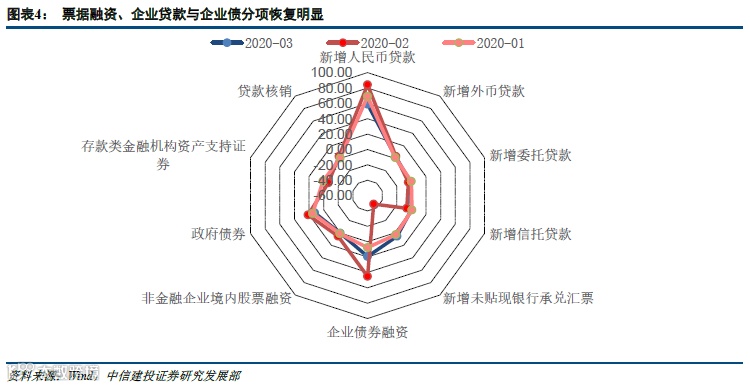 3月社融高于预期,票据融资、企业贷款与企业债是增量的主要来源。从总量上来看2020年3月新增社融5.16万亿元,同比增加2.20万亿元,同比上升53.26%。从结构上来看,社融同比多增主要来自企业贷款、表内外票据和企业债。表内外票据在上个月大幅萎缩后,这个月占比重新回到5.85%,我们认为这与资金宽松企业更倾向低成本融资渠道有关;企业贷款同比多增1.1万亿,企业债同比多增6407,政策引导信贷支持实体经济渐见成效;政府债同比多增近3000亿,主要原因是地方政府专项债提前下发。
