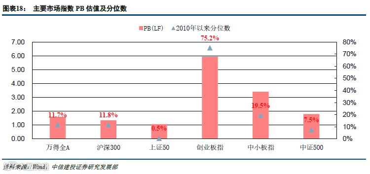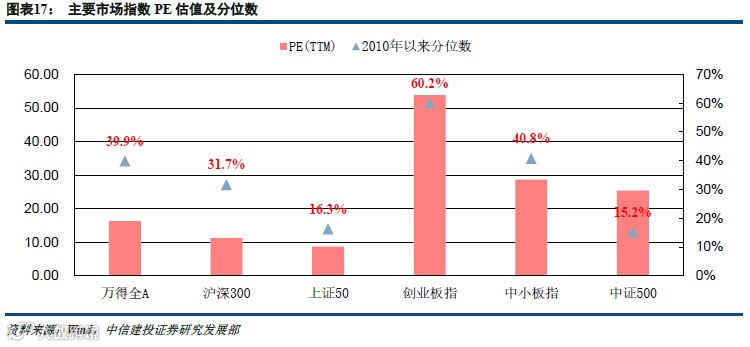 各市场主要指数中,中证500和上证50估值水平较低,PE分别处于2010年以来的15.2%和16.3%分位,上证50的PB估值水平已经处于2010年以来的0.5%分位,位于历史底部;创业板指PE和PB分别为53.84和5.93,分别处于2010年以来的60.2%和75.2%分位,PE估值水平在历史中位数水平附近。