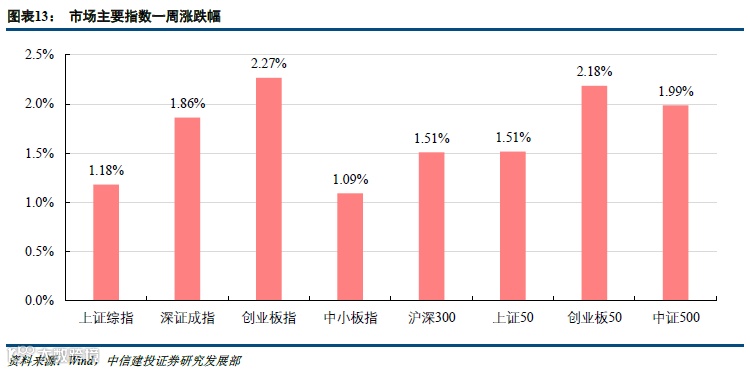 两市成交量环比小幅回升,本周市场收涨。本周两市成交额环比小幅回升,但仍处于缩量的过程。节后首日行情较好,市场普涨,创业板指、中小板指、中证500等指数涨幅均在3%以上,后续市场则继续处于缩量震荡过程,资金观望情绪仍较强。3月社融信贷大幅超预期,但实体受疫情的冲击影响尚需时间消化。本周指数表现上,整体创业板占优,创业板指和创业板50涨幅居前,涨跌幅分别为2.27%和2.18%。中小板指、上证综指、深证成指、上证50、沪深300、中证500等主要市场指数涨幅均在1%以上。