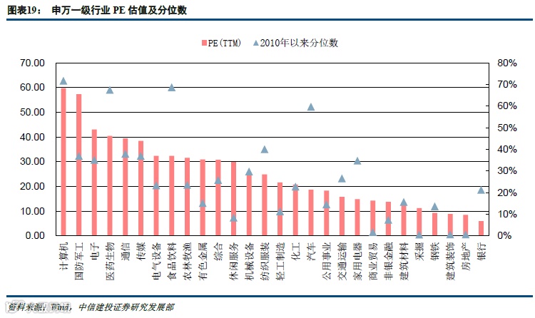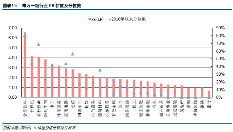 从行业估值来看,目前PE估值水平较低的行业为采掘、房地产、建筑、商贸等行业,当前PE(TTM)分别为11.26/8.54/8.93/14.31,较上一周分别+0.11/+0.01/+0.01/+0.27,分别处于2010年以来的0.6%/0.7%/0.7%/1.8%分位,而PB估值分位数较低的行业主要为银行、公用事业、采掘、建筑、房地产,目前PB(LF)分别为0.68/1.30/0.96/0.93/1.21,较上一周分别+0.00/+0.01/+0.01/+0.01/+0.00,分别处于2010年以来的0.1%/0.2%/0.4%/0.5%/0.6%分位。综合来看,银行、地产、采掘、建筑是估值水平较低的行业,计算机、食品饮料等行业目前估值水平有一定回升,当前估值水平较高,其中计算机PE估值处于2010年以来的71.7%分位,食品饮料PB处于 2010年以来80.8%分位。