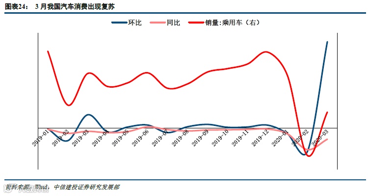 3月,虽然汽车消费仍然下滑明显,但开始出现恢复情况。3月,乘用车销售104.5万辆,同比下降40.4%,比2月78.7%的降幅收窄,3月环比增长317.5%,体现出3月以来随着疫情得到有效控制和复产复工的持续推进,汽车消费在慢慢恢复。我们认为总体上伴随汽车销售的恢复,相关政策无论是中央还是地方层面都在不断推出,稳定汽车消费的意愿坚决。关注充电桩建设情况,这也是新基建的七大重要方向之一。