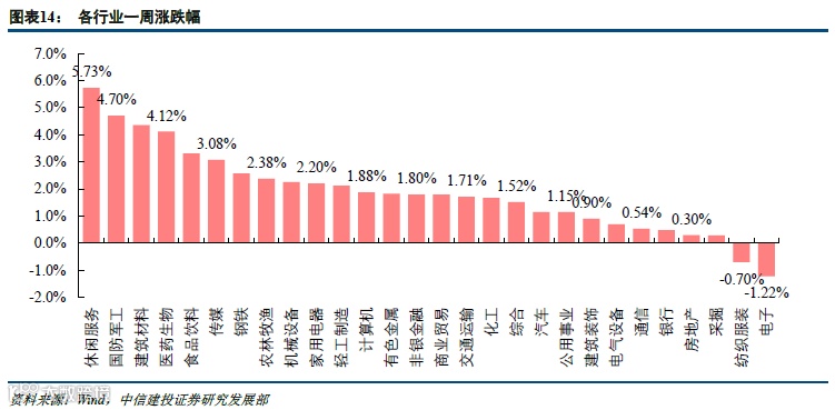 行业层面上,食品饮料、医药等消费板块延续上涨行情,涨幅再次居前,周涨幅分别为3.31%和4.12%。随着餐饮、零售等回暖,休闲服务行业本周涨幅最大。建材行业受益于下游基建带动需求,水泥价格边际也出现环比提升迹象,本周也迎来行情,周涨幅达到4.36%。食品饮料、农牧等必选板块继续延续疫情下的上涨行情,3月下旬以来涨幅较大。本周行业景气观察我们发现螺纹钢价格环比出现上涨,原材料铁矿石价格下跌,有利于增厚螺纹钢行业利润。本周钢铁行业收涨2.57%。当前海外疫情仍具有较大不确定性,短期仍主要聚焦国内需求,食品饮料、医药等板块仍具有相对优势。