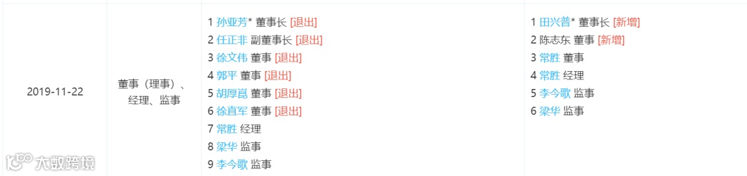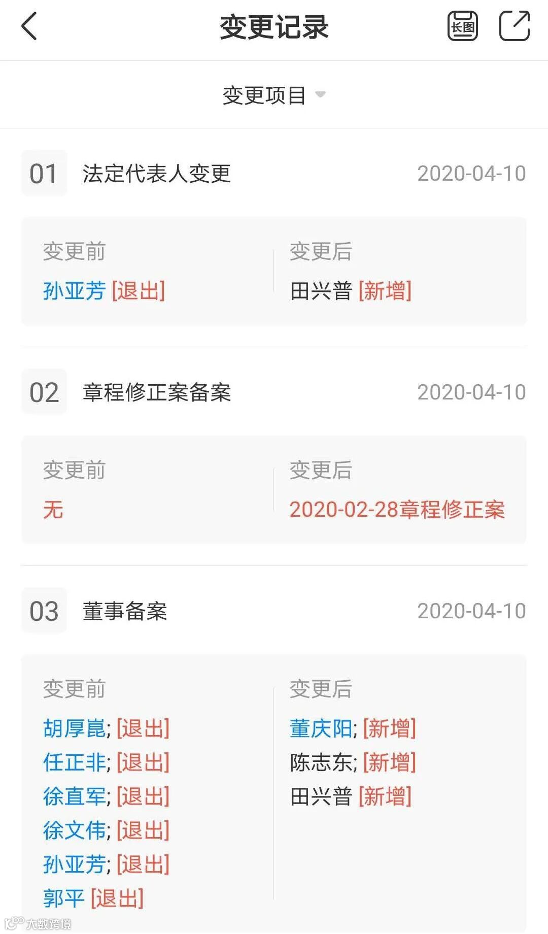 除了上述两家子公司的董事会变更外,在2019年12月30日,华为另一被全资控股子公司杭州华为企业通信技术有限公司发生一系列董监高变更,郭平卸任法定代表人、董事长,由田兴普接任;此外,孟晚舟卸任董事,新增董事庞云光。