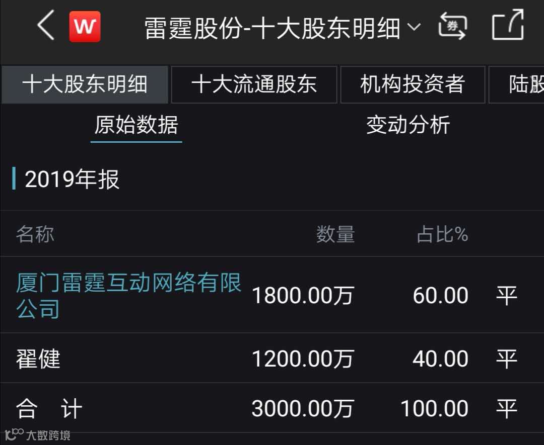 从雷霆股份的股权结构来看,持股比例集中。分别为厦门雷霆互动网络有限公司(以下简称“雷霆互动”)持股60%,翟健持股40%。