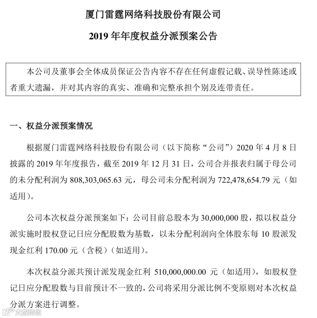 4月8日,雷霆股份计划分红的规模令人咋舌,高达5.1亿,每10股派现170元。