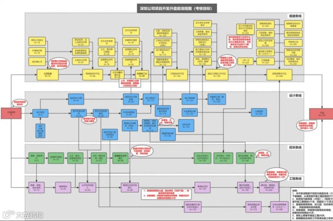 在开发提速的要求下,投运开发部通过对标标杆企业优秀做法及经验,梳理出各条线开发全流程图,制定开发提速目标及措施,强化系统思维,做到管理无死角、无盲区。投运开发部以实现项目进度为主要目标,组织各专业条线进行充分研讨,明确项目节点计划,优化工期,并通过绩效考核强关联节点,力争公司开发速度更上一层楼。