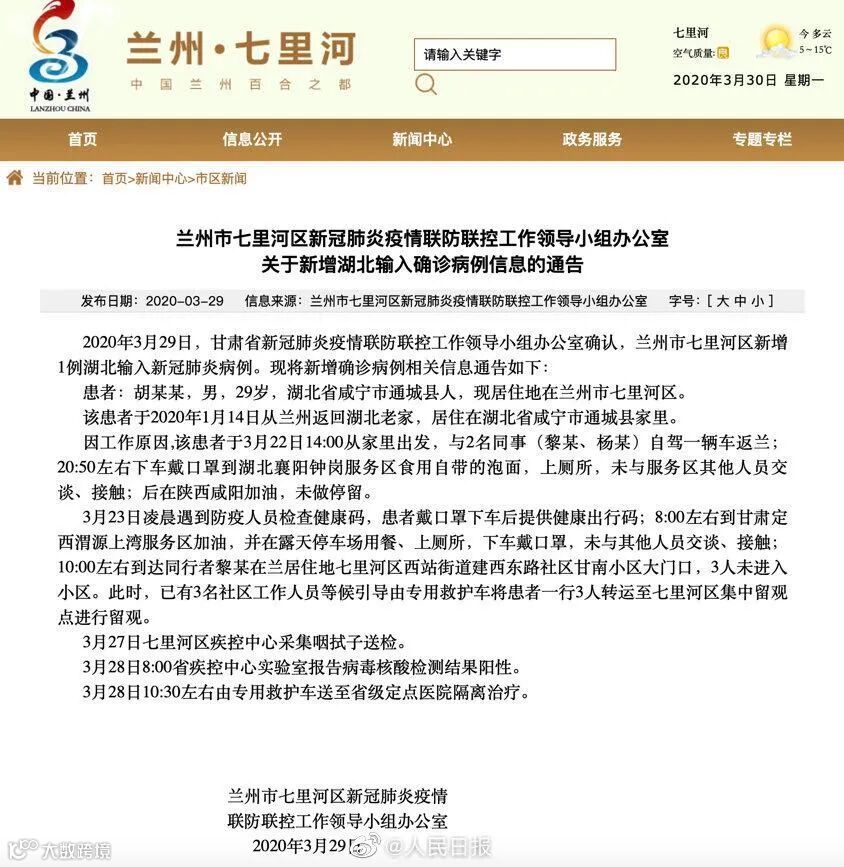 3月28日20时至3月29日20时,甘肃新增湖北输入新冠肺炎确诊病例1例,该病例于1月14日由兰州去湖北省咸宁市老家,3月22日自驾车从湖北省咸宁市(低风险区)持湖北健康码“绿码”返兰,3月23日到达兰州所居小区门口,由社区工作人员专门安排转运至七里河区集中留观点医学隔离观察,隔离期间做了相关检查,3月28日CT结果显示:右肺中叶内侧段和左肺舌叶小片状磨玻璃渗出影。根据流行病学史及CT检查结果,3月28日确定为疑似病例。3月29日新型冠状病毒核酸检测阳性,确诊为新冠肺炎。目前在省级定点医院住院隔离治疗,病情平稳。累计追踪到密切接触者2人,已全部集中隔离。