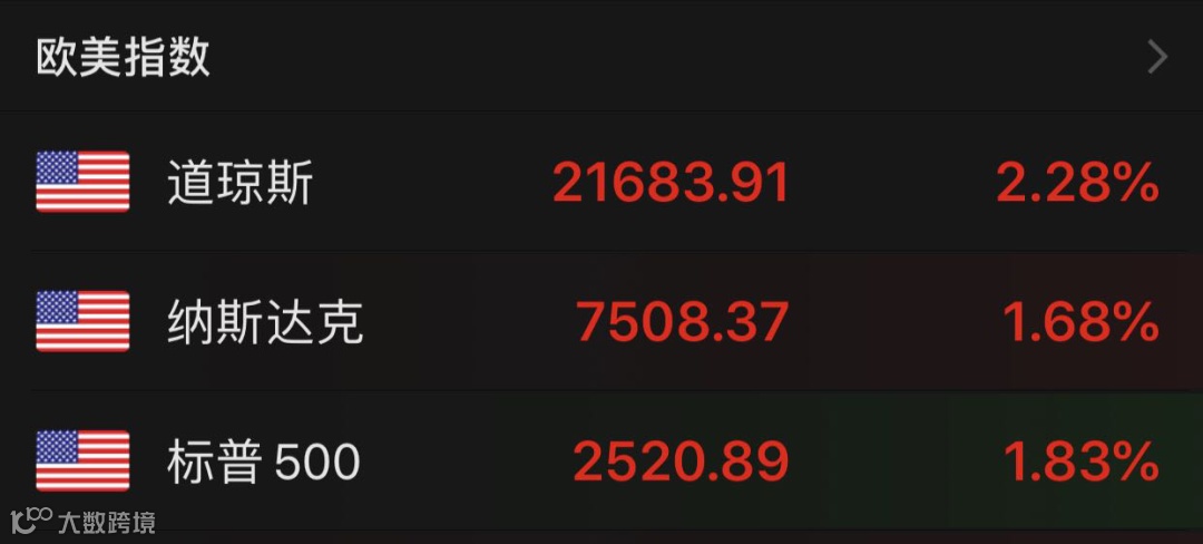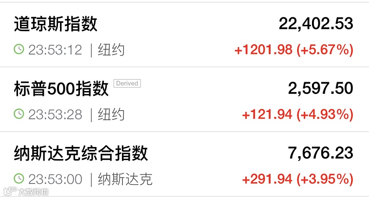 受此影响,全球市场全线大涨。截至券商中国发稿,道指大涨逾1200点,涨幅超过5%,纳指涨近4%,标普500指数涨近5%。欧洲市场亦由杀跌转为全线翻红。