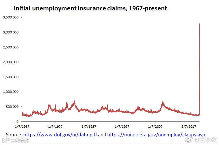 失业救济申请被认为是了解当前经济状况的最快窗口。就在鲍威尔接受采访后不久,美国劳工部公布了美国3月21日当周初请失业金人数,这一数字激增至328万人。这个数字打破了2009年3月的66.5万的大衰退高峰,以及1982年10月的69.5万的历史最高水平。