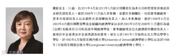另外,从梁红出现在中金公司的历年年报之上即可看出,她在中金公司已是高管身份。2015年4月,梁红即已被委任为中金公司管理委员会成员,在年报“出场”顺序中排名位于前列。