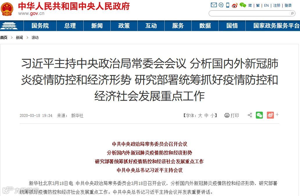 据新华社消息,中共中央政治局常务委员会3月18日召开会议,分析国内外新冠肺炎疫情防控和经济形势,研究部署统筹抓好疫情防控和经济社会发展重点工作。中共中央总书记习近平主持会议并发表重要讲话。