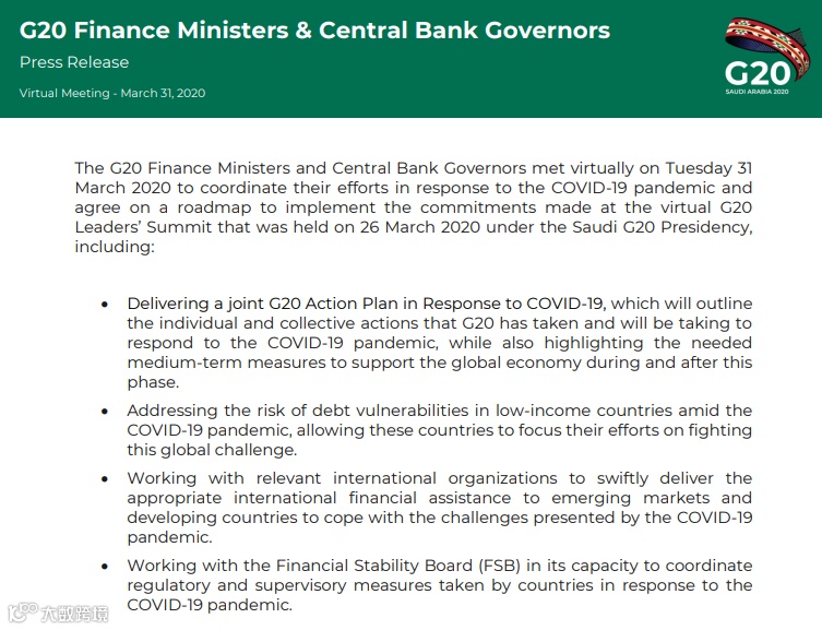 就在美联储再推新举措的时候,二十国集团(G20)财长和央行行长视频会议也在举行当中。该会议结束之后,亦发布了一则声明。声明指出,会议旨在协调应对COVID-19大流行病,并商定一个路线图,以执行2020年3月26日在沙特担任二十国集团主席国期间举行的二十国集团领导人虚拟峰会上作出的承诺,包括: