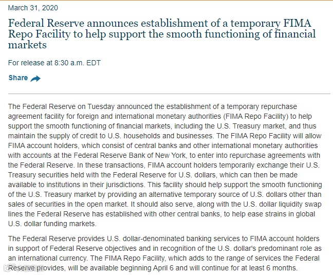 美联储周二宣布建立针对外国和国际货币当局的临时回购协议工具(FIMA回购工具),以帮助支持包括美国国债市场在内的金融市场平稳运转,从而维持对美国的信贷供应。FIMA回购机制将使FIMA账户持有人(与中央银行和其他国际金融机构一起在纽约联邦储备银行开户)可以与美联储订立回购协议。