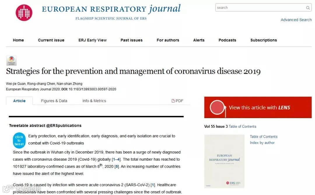 受《欧洲呼吸杂志》邀请,钟南山院士与广州呼吸健康研究院关伟杰副研究员、深圳市人民医院陈荣昌教授发表述评文章,向全球同行介绍了新冠疫情防控的经验。