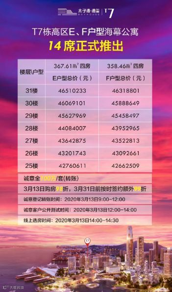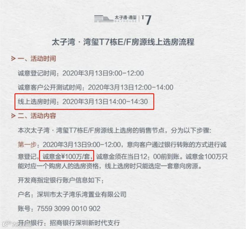 选房须知显示,此次招商太子湾·湾玺的诚意金为100万元/套,诚意登记时间3月13日9:00-12:00,3月13日14:00-14:30,全程半小时进行线上选房。