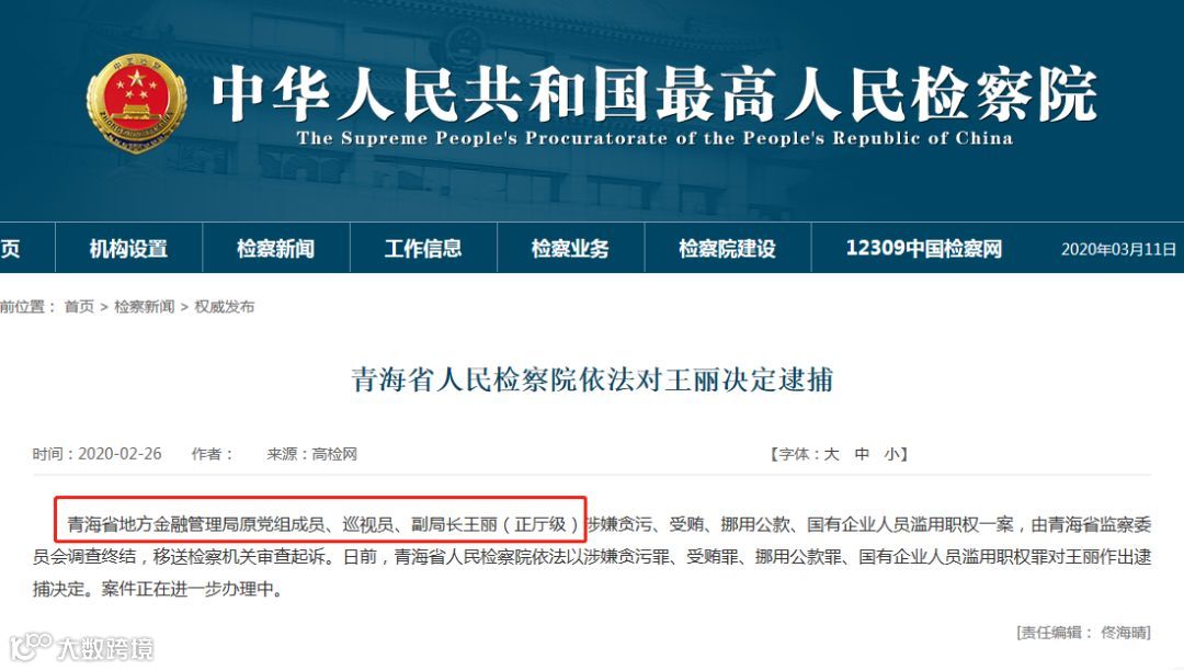 今年2月26日,最高人民检察院官网披露,青海省人民检察院依法对青海银行原董事长、青海地方金融监督管理局副局长王丽决定逮捕。