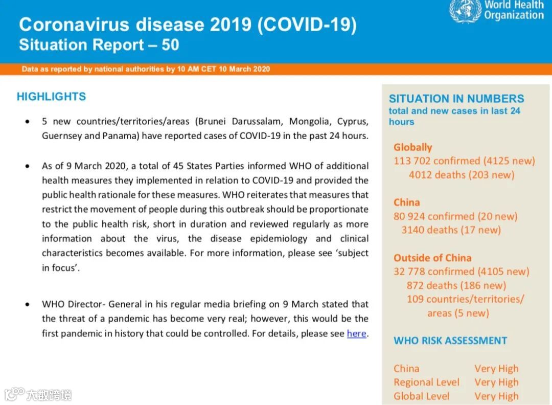 当地时间3月10日,世卫组织发布最新一期新冠肺炎情况每日报告。截至欧洲中部时间10日上午10时(北京时间17时),中国以外共109个国家/领地/地区确诊新冠肺炎32778例(新增4105例),死亡共计872例(新增186例)。