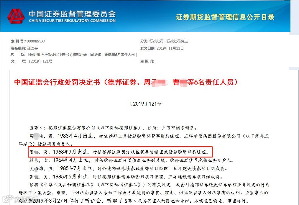 除了诉讼标的惊人外,曹某本人的从业历程也令人关注。2019年11月,证监会对德邦证券及相关责任人员在“五洋债”中的疏漏开出严厉罚单,曹某即为两名被撤销从业资格的负责人之一,且被采取5年证券市场禁入措施。