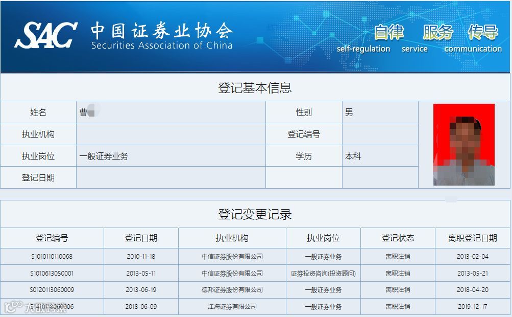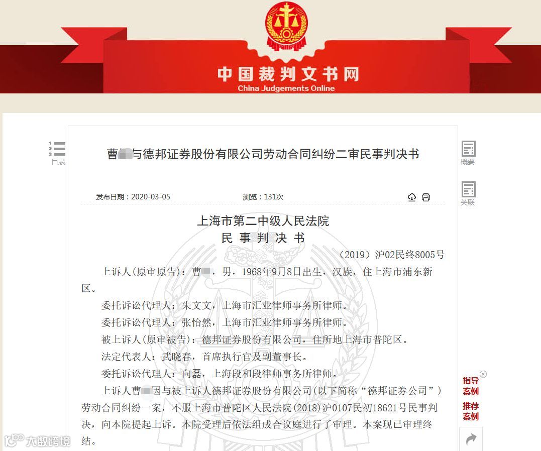 而从此次的诉讼可以看出,在2018年4月曹某已因“旷工”的理由离开德邦证券,随后加入江海证券。在证监会罚单落地后,2019年12月,曹某办理离职注销登记。