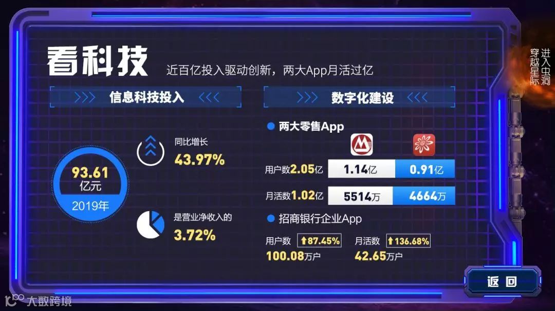 “招商银行”“掌上生活”两大 App 月活跃用户突破 1 亿,零售金融数字化转型追星逐辰,公司金融数字化转型向“南”而行;云计算能力行业领先,开放的数字化基础设施云台初垒…