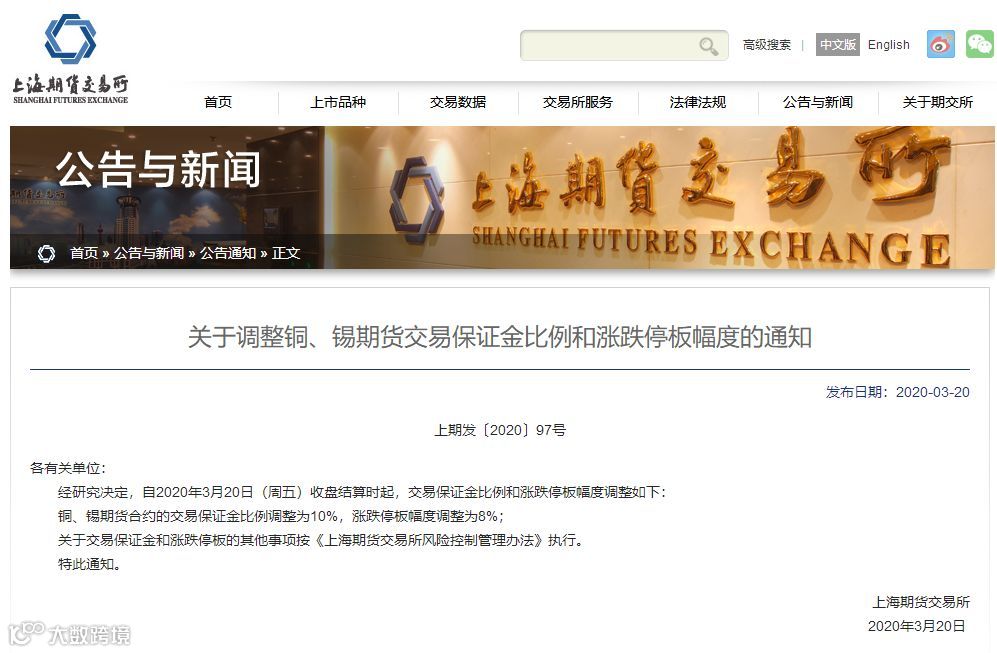 3月20日,上期所发布公告,自当日收盘结算起,将铜、锡期货合约交易保证金比例调整为10%,涨跌停板幅度调整为8%。而就在前一天,上期所刚刚对铝、锌、铅及天然橡胶期货的做出类似上调,上期能源也对20号胶期货做出相应调整。