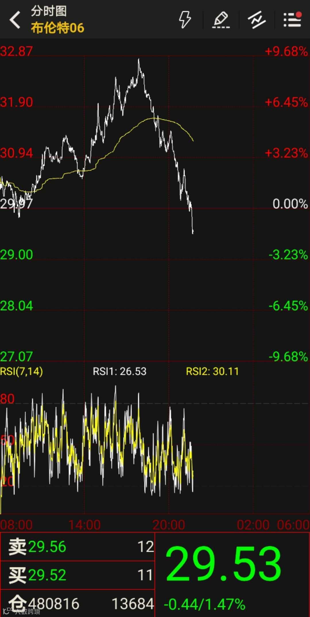 商品的强势表现在海外交易时段未能得到延续。截至记者发稿时,布伦特原油期货主力合约价格自日内高位持续下跌,从最高上涨近10%转为下跌。