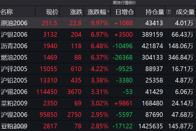 周五的国内商品市场延续前日反弹势头,原油期货和白银期货日内均高开上行,收盘涨停。其中上海原油期货主力SC2006合约收报251.5元/桶,涨幅为9.97%,领跑整个商品市场。白银期货上涨6.97%紧随其后,沥青、燃料油涨幅均超过6%,有色金属中沪锌、沪铅和沪锡涨幅超过3%。