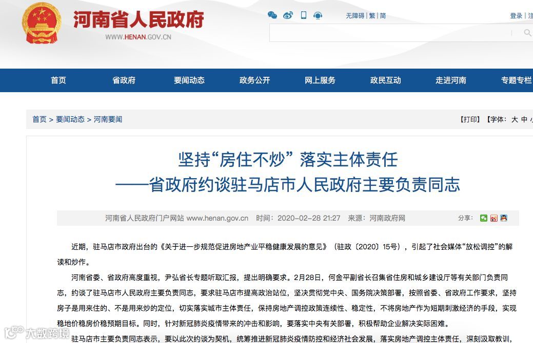 2月28日,河南省人民政府网站发布消息,省政府约谈驻马店市人民政府主要负责同志,坚持“房住不炒”,落实主体责任。河南省委、省政府高度重视,省长尹弘专题听取汇报,提出明确要求。