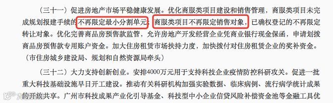 具体而言,广州的商服类项目(公寓、商铺、写字楼),不再限定最小分割单元,不再限定销售对象,也不再限定转让对象。
