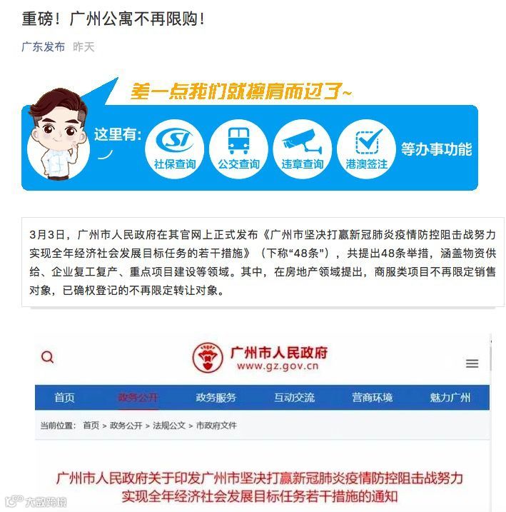 券商中国记者注意到,就连广东省人民政府新闻办公室的官微“广东发布”都转载了南方日报消息,标题为《重磅!广州公寓不再限购》的消息。