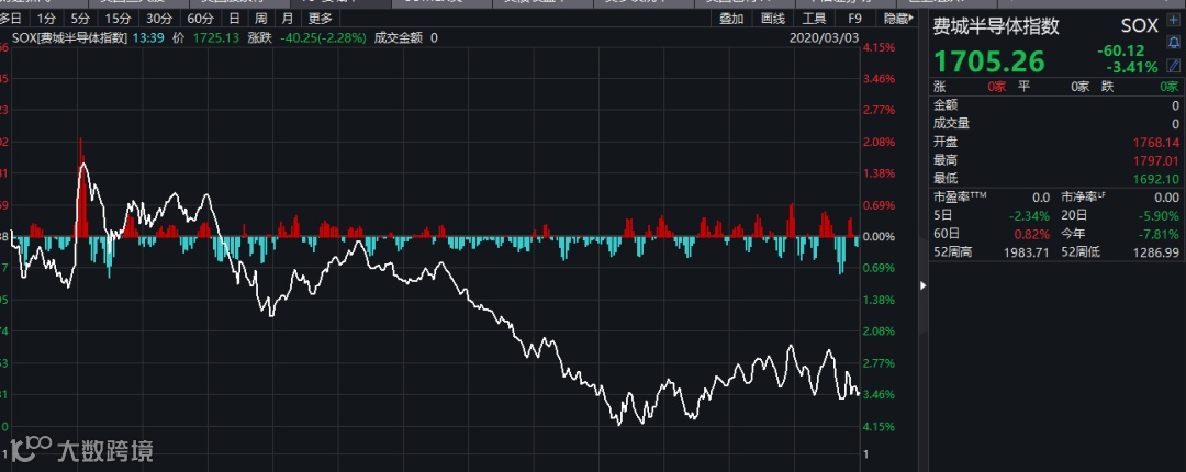 美国大型科技股全线走低,苹果跌3.18%,亚马逊跌2.3%,奈飞跌3.22%,谷歌跌3.51%,Facebook跌5.37%,微软跌4.79%。特斯拉小幅上涨。费城半导体指数狂跌3.42%。