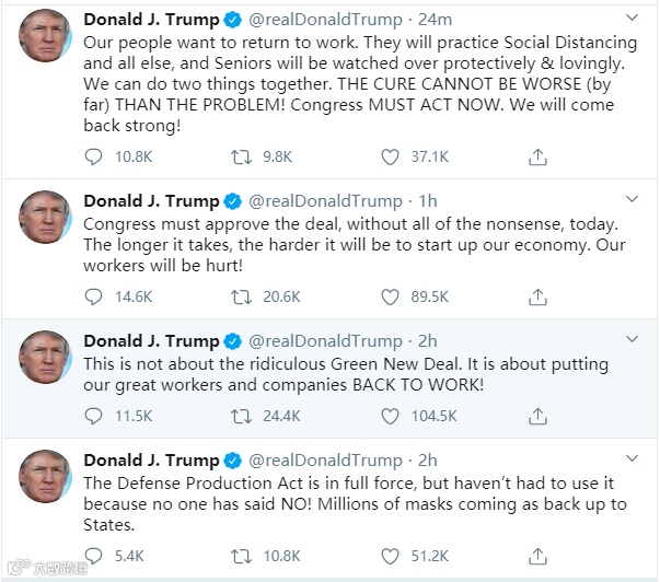 北京时间24日晚上10点,美国国会开启新一轮针对经济刺激计划的讨论。此前,两轮投票都未能通过刺激计划。在国会讨论开启之前,特朗普连发四推,他希望国会当晚能通过刺激计划。
