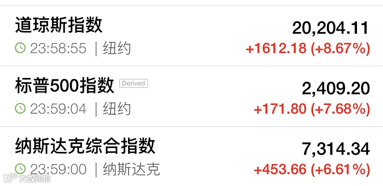 2020年3月24日,全球股市大反攻日。亚太市场收盘全线暴走,欧洲股市亦十分强劲,美股开盘涨势火爆异常。截至发稿时间,道指大涨逾1600点,涨幅超过8%,强势收复两万点关键点位。