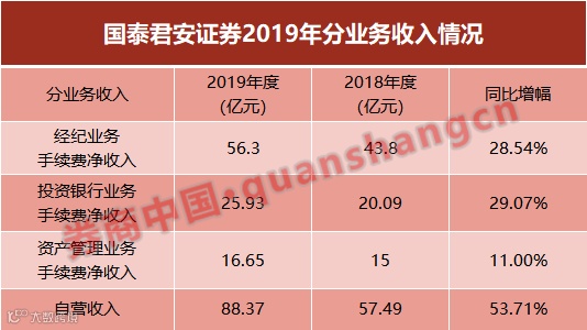 2019年,受益于资本市场改革以及市场行情转暖等多重因素,证券公司业绩回暖。国泰君安2019年实现营业收入299.49亿元,实现归母净利润86.37亿元,较上年分别增长31.83%和28.76%。