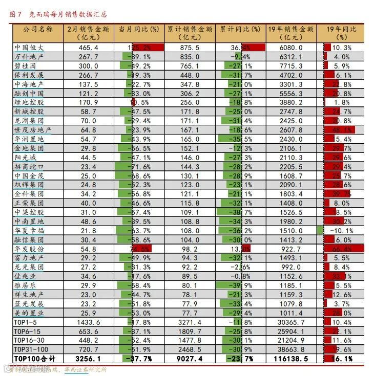 克尔瑞数据显示,2月TOP30房企中有27家房企销售增速同比负增长,且11家房企增速下滑超过50%,仅3家实现了销售规模的正增长,分别为恒大、华发股份和绿地控股。