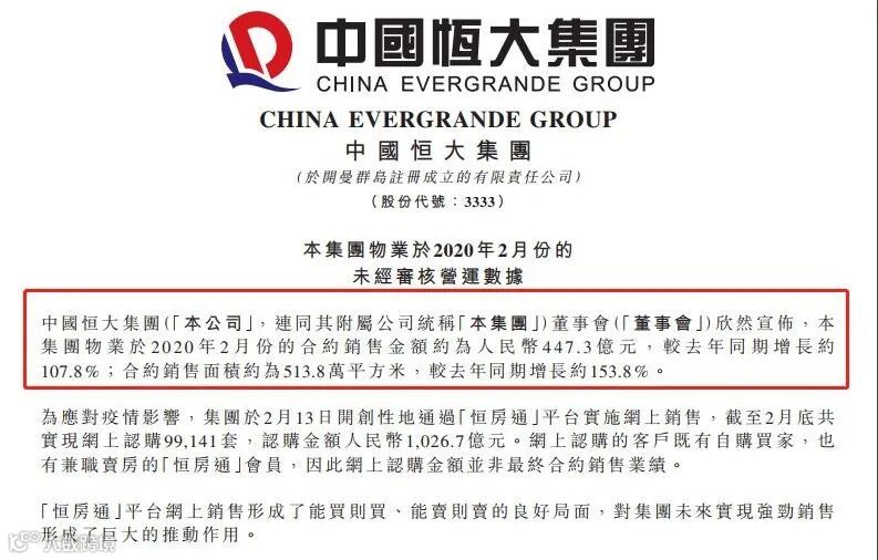 3月5日,中国恒大(3333.HK)发布公告,今年2月实现合约销售447.3亿,同比大增108%,销售面积513.8万平方米,同比大增154%,均位居行业首位。