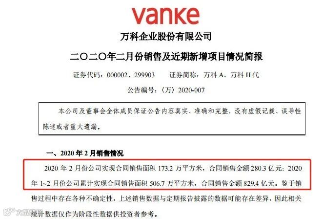 中信建投分析师竺劲表示,由于受到新冠肺炎疫情的影响,万科2月份推货及销售有所停滞,导致2月销售规模仅高于2016年水平,明显低于2017~2019年的同期水平。