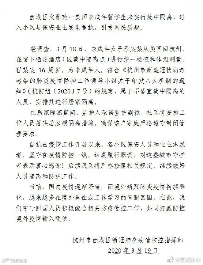 3月19日下午,澎湃新闻从浙江省杭州市西湖区人民政府办公室官方微博获悉,杭州市西湖区新冠肺炎疫情防控指挥部对于三墩镇文鼎苑小区未成年女子程某某居家隔离做了如下情况说明: