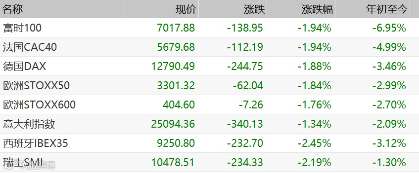 25日,欧洲主要股指收盘也全线重挫。据Wind数据,德国DAX指数跌1.88%,报12790.49点;法国CAC40指数跌1.94%,报5679.68点;英国富时100指数跌1.94%,报7017.88点。这也是欧洲主要股市连续连日大跌,泛欧跌至近两个月低点、两天来市值共计蒸发近7000亿美元。