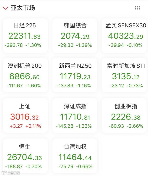 亚太股市方面,几乎全线飘绿。截至券商中国发稿,仅A股沪指飘红,日经指数、韩国综指跌幅均超过1%。