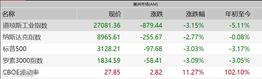 受疫情影响,美股三大股指连续第二日全线大幅收跌,其中,道指跌3.15%,标普指数跌3.03%,纳斯达克指数跌2.77%。