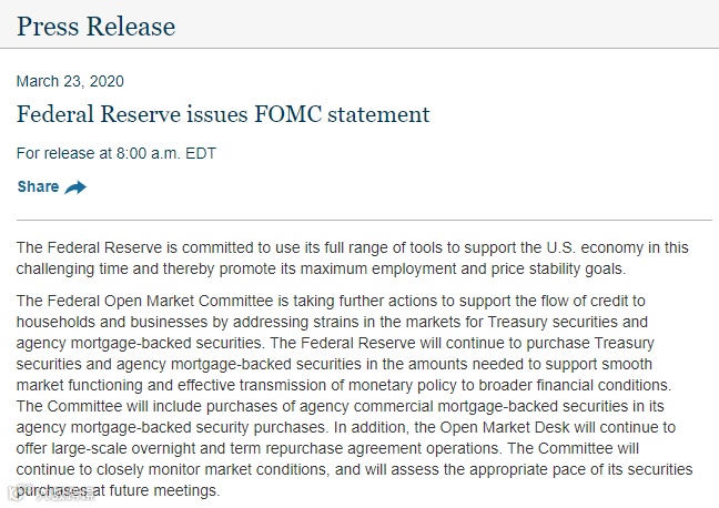 3月23日,美联储再度采取行动。美联储表示,将致力于在这一充满挑战的时代,使用其全部工具来支持美国经济,从而促进其最大就业和价格稳定的目标。联邦公开市场委员会正在采取进一步行动,通过解决国债和代理抵押支持证券的市场压力来支持信贷向家庭和企业的流动。美联储将继续购买必要数量的国库券和机构抵押支持证券,以支持平稳的市场运作以及将货币政策有效地传导至更广泛的金融领域。