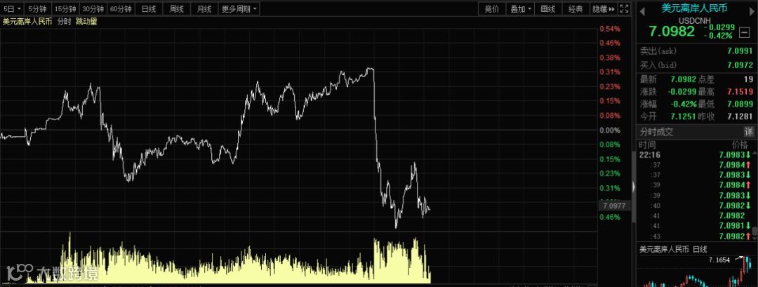 离岸人民币直线拉升300点。
