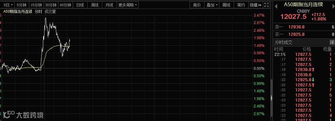 人民币资产全线上涨。A50直线拉升后,呈震荡走势。