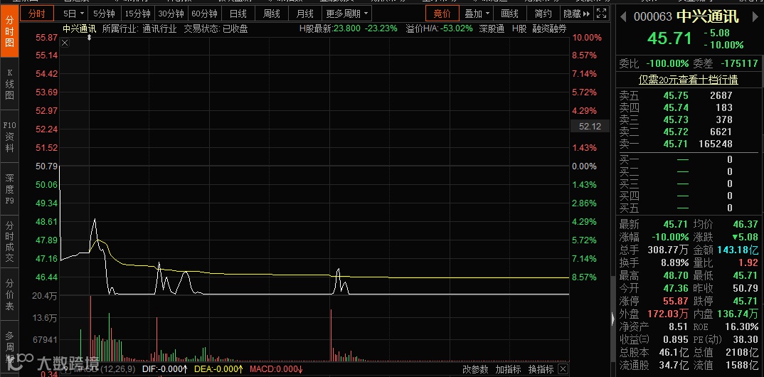 当日,中兴通讯A股收盘于45.71元/股,下跌10%,换手率8.89%;H股收盘于23.8港元/股,大跌23.23%,创下中兴通讯H股今年以来新低。中兴通讯A股市值蒸发约234亿元、H股市值蒸发约54.43亿港元。