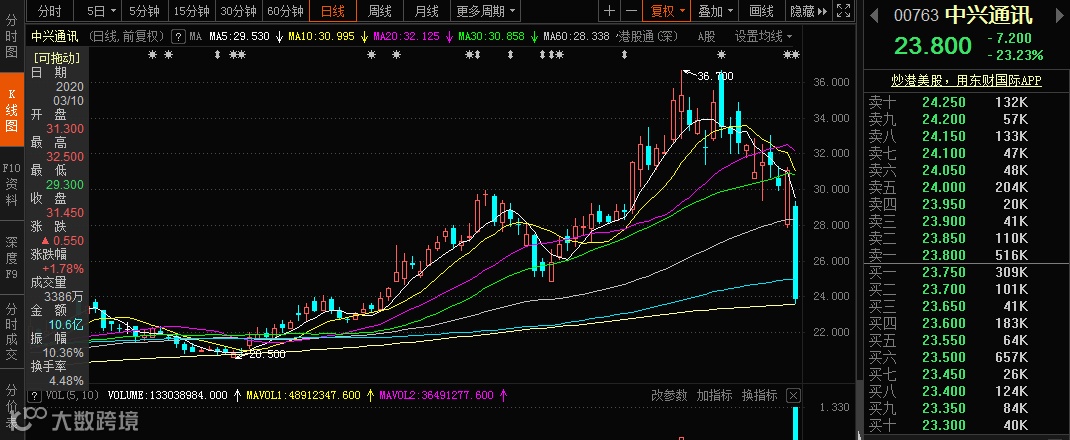 3月16日,受上述传闻影响,中兴通讯A股一早出现跌停,H股也未能幸免。